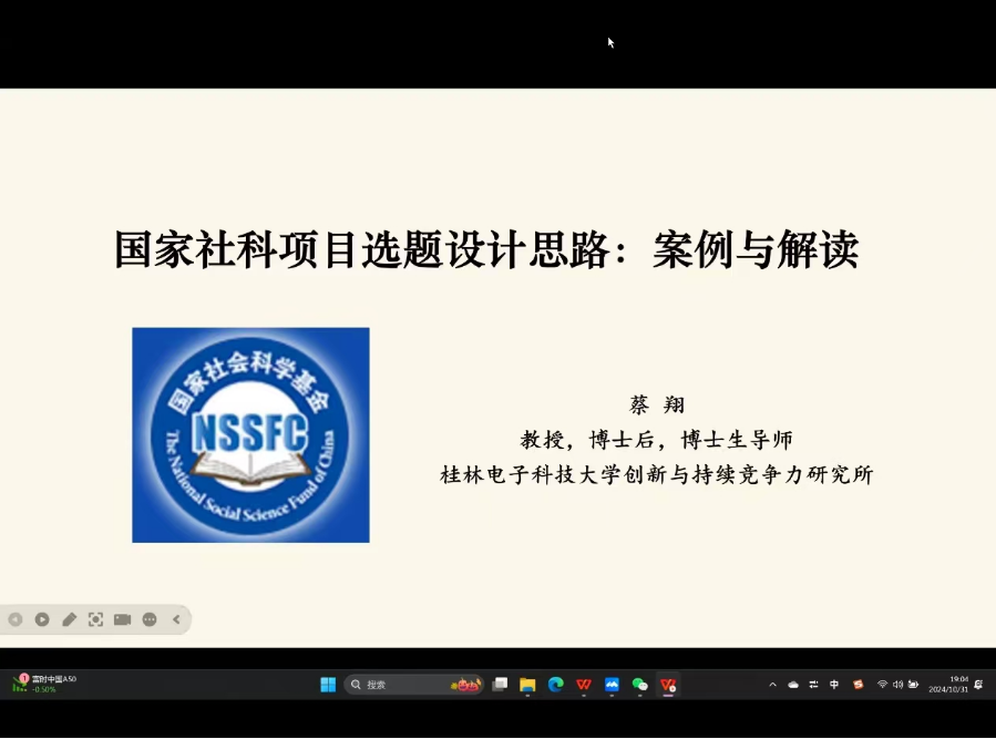 (通讯员 谢薇)为了帮助学院师生更好地理解国家社科项目的申报要求,提升选题质量,推动科研创新与学科发展。10月31日19:00,必赢线路检测中心通过腾讯会议举行了长江经管讲坛第六十五讲,桂林电子科技大学软科学研究院副院长蔡翔受邀宣讲,针对国家社科项目的选题设计思路进行了全面而深入的解读。必赢线路检测中心副院长裴潇、教师代表、2023级和2024级研究生到场参会。本次会议由副教授周欣星主持。