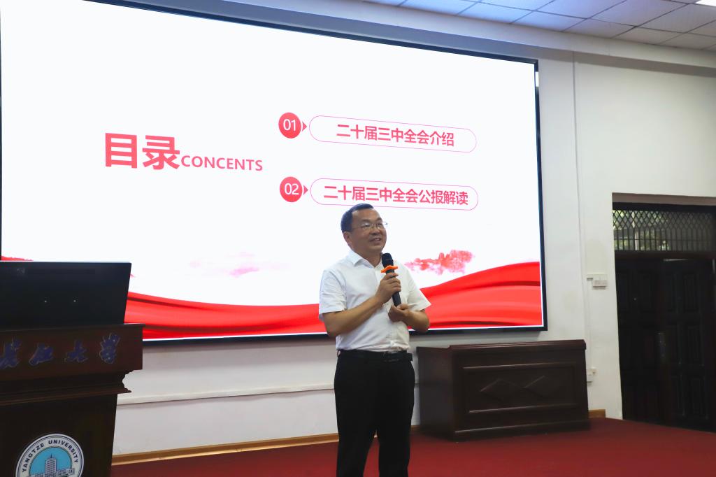 随后,樊帆重点围绕中国式现代化对二十届三中全会公报的内容进行了宣讲。他指出,当前和今后一个时期是以中国式现代化全面推进强国建设、民族复兴伟业的关键时期。中国式现代化不仅是我国未来发展的必由之路,也是在全球舞台上展现中国智慧和中国方案的重要载体。樊帆要求大家要准确把握公报精神实质,把学习会议精神与科研教学相结合,将会议精神融入日常科研教学工作之中,为学校高质量发展、双一流建设做贡献。