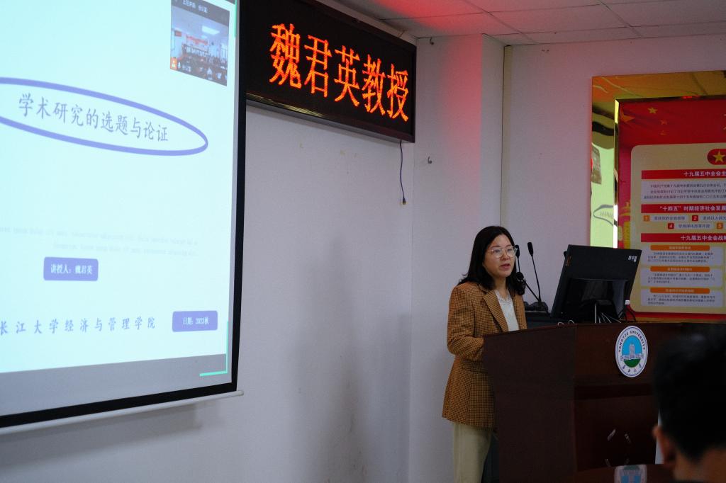 (通讯员:李娜/文 何小艳/图)11月19日上午九点,“长大经管论坛”第四十九讲在文科楼505会议室举行。此次讲座的主题为“学术研究的选题与论证”,主讲人为必赢线路检测中心魏君英教授。本次论坛由必赢线路检测中心副院长何蒲明主持,必赢线路检测中心硕士生导师和全日制研究生线下参与、非全日制研究生线上同步参加。