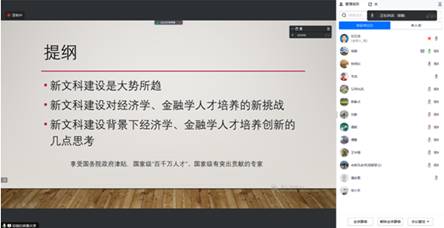 本次会议分两阶段进行。会议第一阶段,邹薇教授以“新文科建设背景下经济学、金融学拔尖人才培养的创新”为题作了精彩讲座。邹教授首先指出新文科建设是大势所趋;然后介绍了卓越拔尖计划从1.0到2.0的发展历程,分析了新时代“卓越拔尖计划2.0”的新要求以及新文科建设对经济学、金融学专业人才培养的新挑战;最后针对新文科建设背景下经济学、金融学人才培养创新问题,介绍了个人心得体会,认为要做好人才培养创新,必须要处理好基础性与前沿线、国际化与本土化、系统性与宽口径、经济学与金融学、传统授课与实践教学等五种关系,向内打通文史哲艺、涵育文化灵魂,向外融合自然科学、吸纳理性方法。