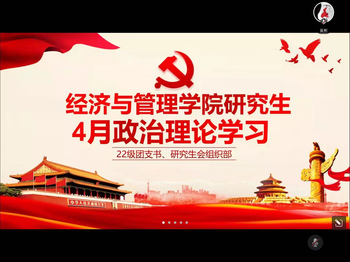 (通讯员:吴彬)为丰富研究生学习生活,加强对政治理论知识的掌握,4月20日晚7点,必赢线路检测中心通过腾讯会议开展四月政治理论学习活动。本次活动由研究生会组织部及22级团支书组织,全体研究生参与活动。