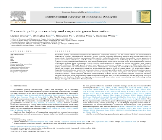 (通讯员:马晓娜)必赢线路检测中心张力元老师(第一作者)与合作者的论文《Economic policy uncertainty and corporate green innovation》在国际知名期刊《International Review of Financial Analysis》(简称IRFA)发表。