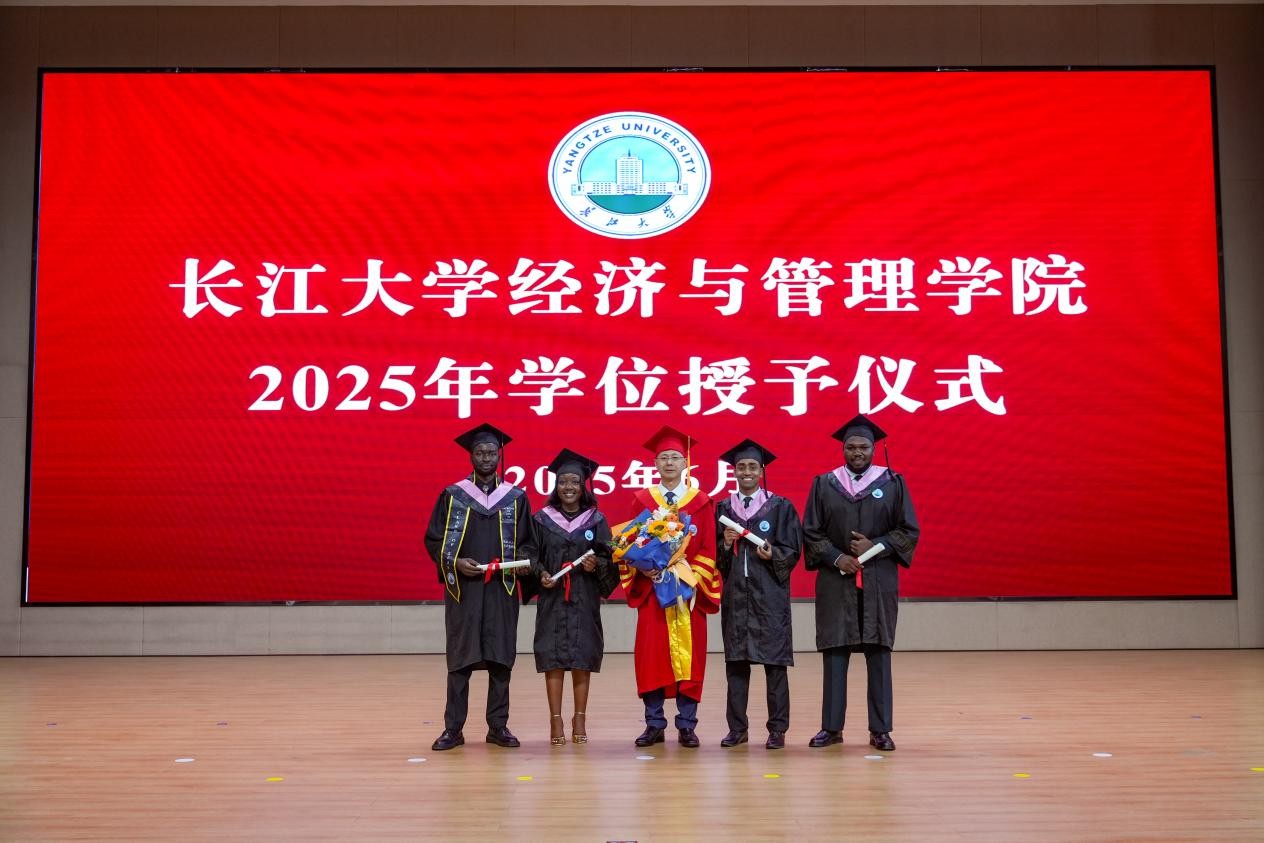 温馨而庄重的一幕格外引人注目,学院来自非洲的留学生毕业生代表在授学位后,将鲜花和写有“我爱长大”、“我爱经管”的打卡牌带到台前与校长亲切合影,用镜头定格下他们在我校学有所成的荣耀瞬间。