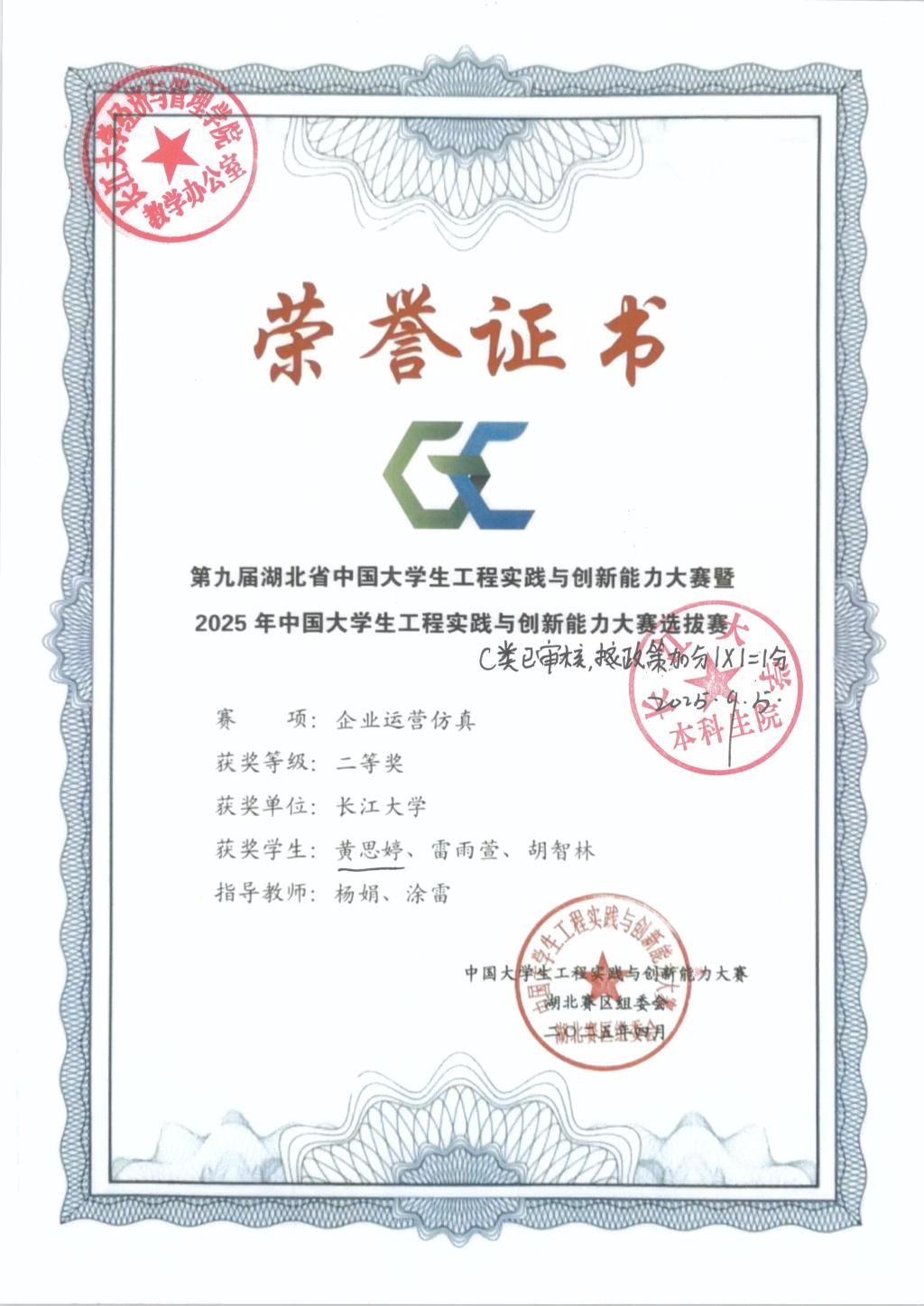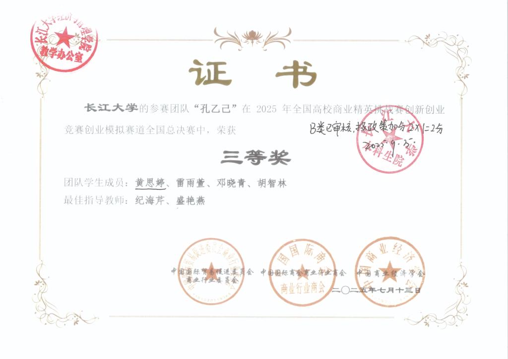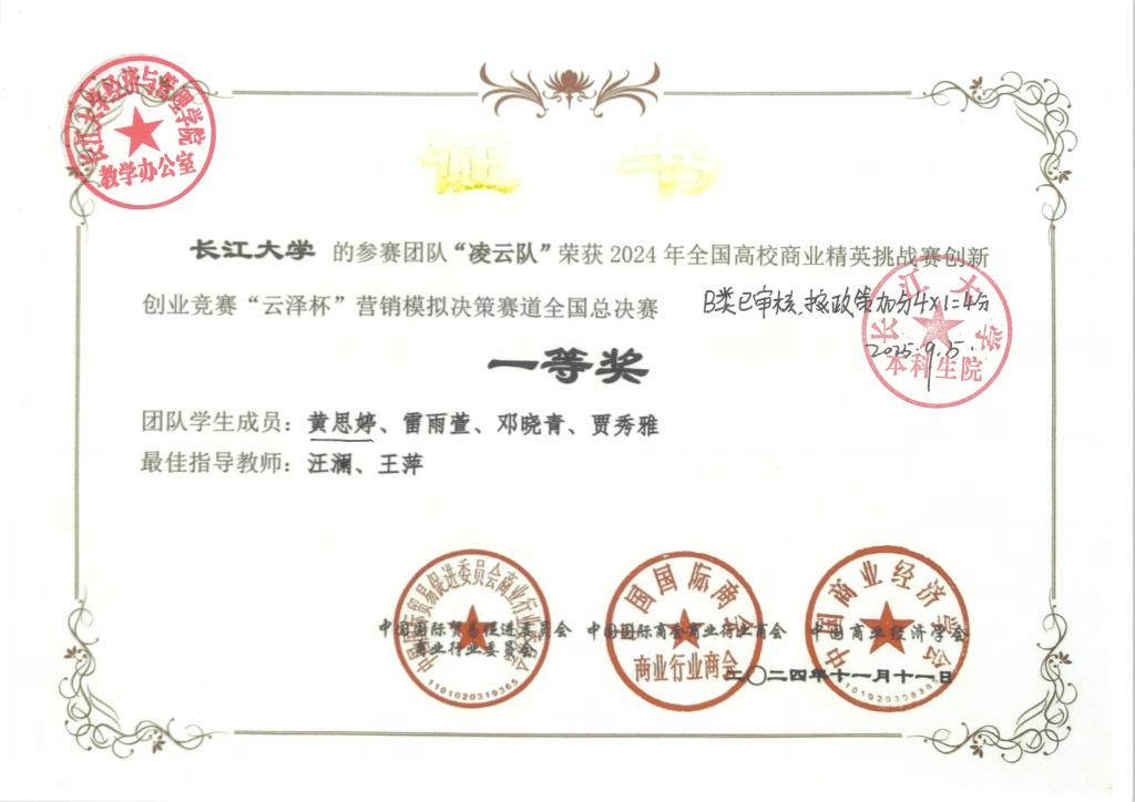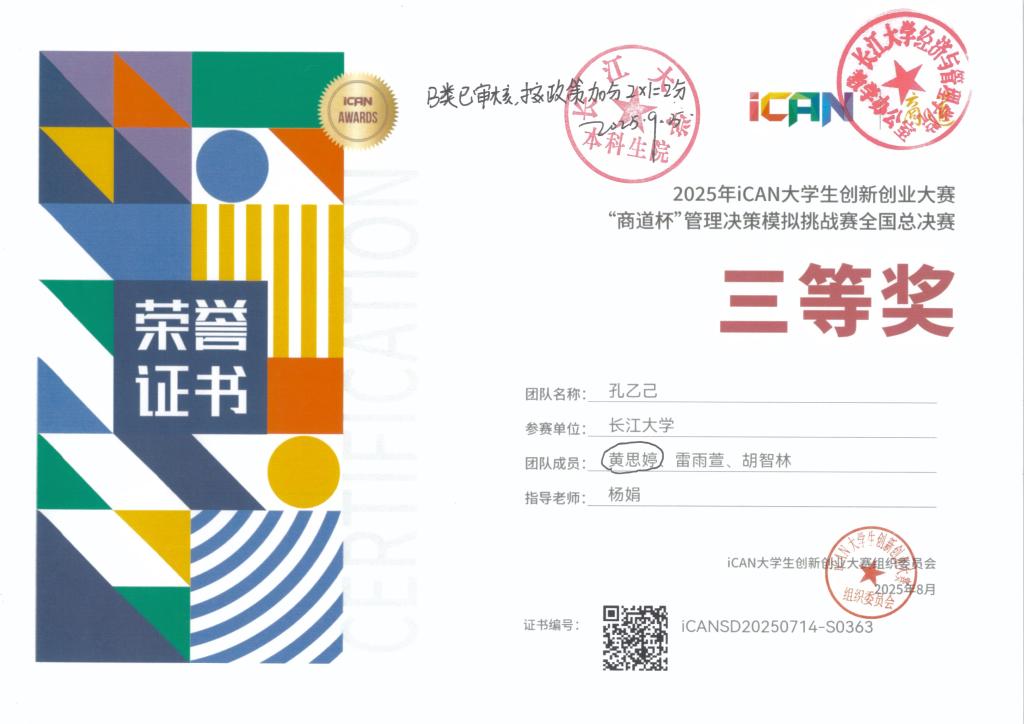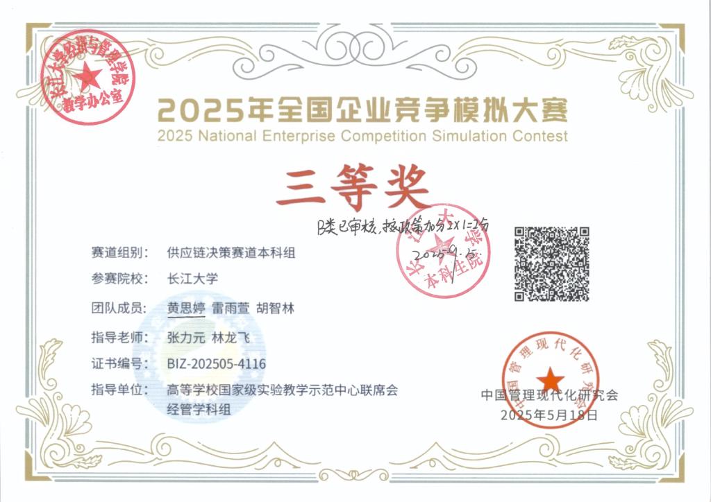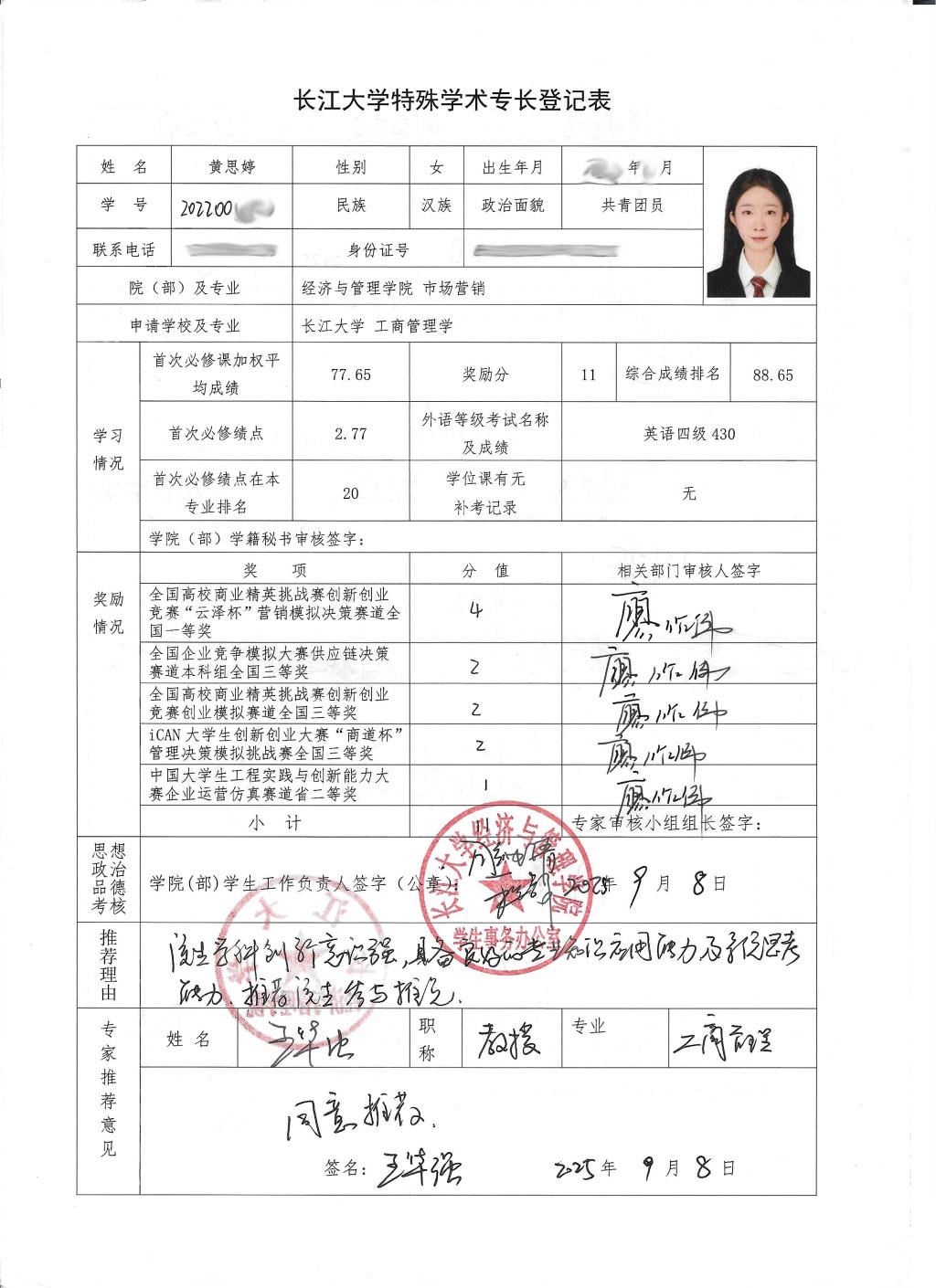 黄思婷,女,学号202200****,必赢线路检测中心市场营销专业本科生。获得2025年全国企业竞争模拟大赛三等奖 、2024年全国高校商业精英挑战赛一等奖、第九届湖北省中国大学生工程实践与创新能力大赛二等奖、2025年ican大学生创新创业大赛全国三等奖、2025年全国高校商业精英挑战赛三等奖。根据《长江大学推荐优秀应届本科毕业生免试攻读硕士学位研究生管理办法》(长大校发 〔2025〕9号)和《关于做好推荐2026届优秀本科毕业生免试攻读硕士学位研究生工作的通知》等文件精神和通知要求,9月8日19:30-20:00在文科大楼416开展特殊学术专长答辩会,经答辩决定同意黄思婷进行2026届研究生推免申请(不是正式推免)。 现通过必赢线路检测中心网站主页予以公示,公示日期为2025年9月10日至2025年9月12日,如有异议,请于2025年9月12日前与学院教学办联系,电话:0716-8060985。现将材料公示如下: