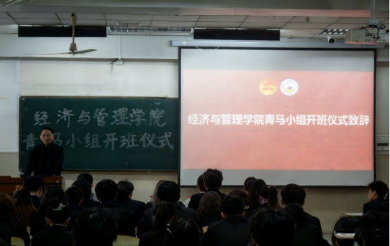 下午2点,开班仪式在雄壮的国歌声中拉开帷幕。学院团委书记杨雪宣读第五期青马小组学员名单,并就新一期青马小组培养模式做了详细阐述。本期青马小组将通过理论学习、社会实践和党性锻炼等多种形式,强化学员的理想信念教育,提升综合素养。李仕维同学作为青马小组新学员代表上台发言。他以真挚的语言分享了个人加入青马小组的初衷与感悟,表达了对马克思主义理论的浓厚兴趣和坚定追随。
